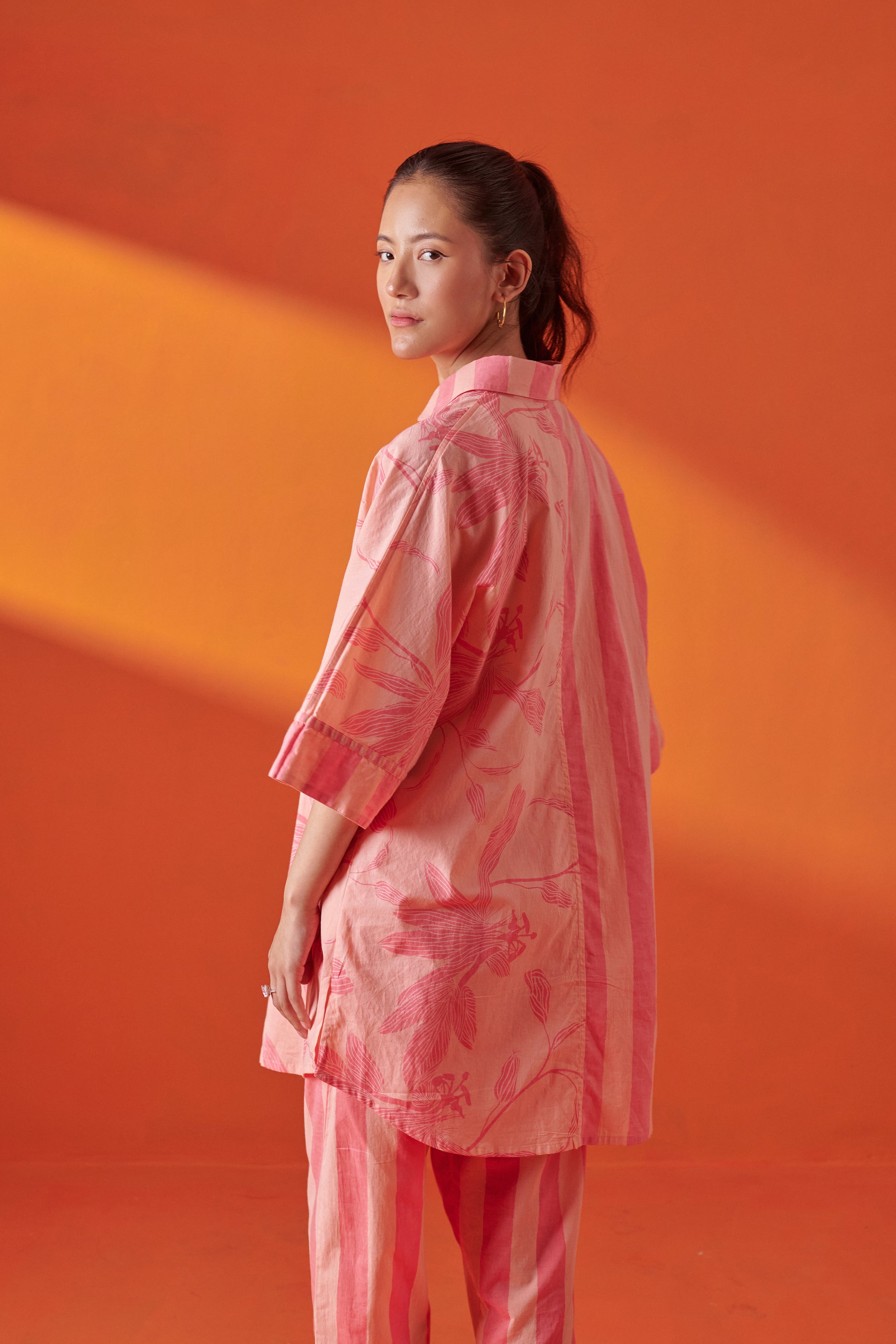 A breezy take on summer dressing, the Arlo Long Shirt is an oversized silhouette that plays with contrast and calm. Featuring an unexpected pairing of tropical motifs with soft pink and peach stripes, this shirt is all about easy elegance.