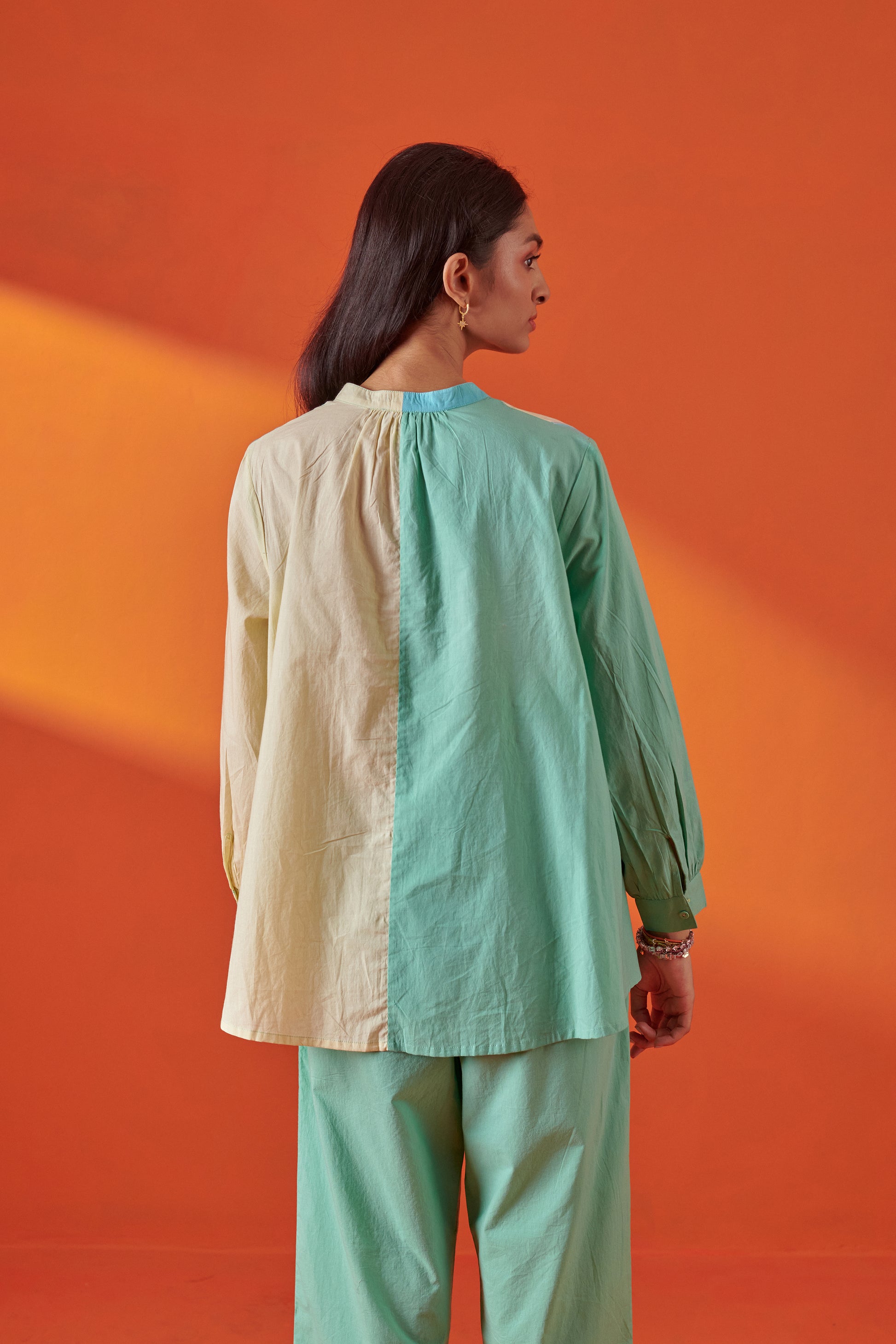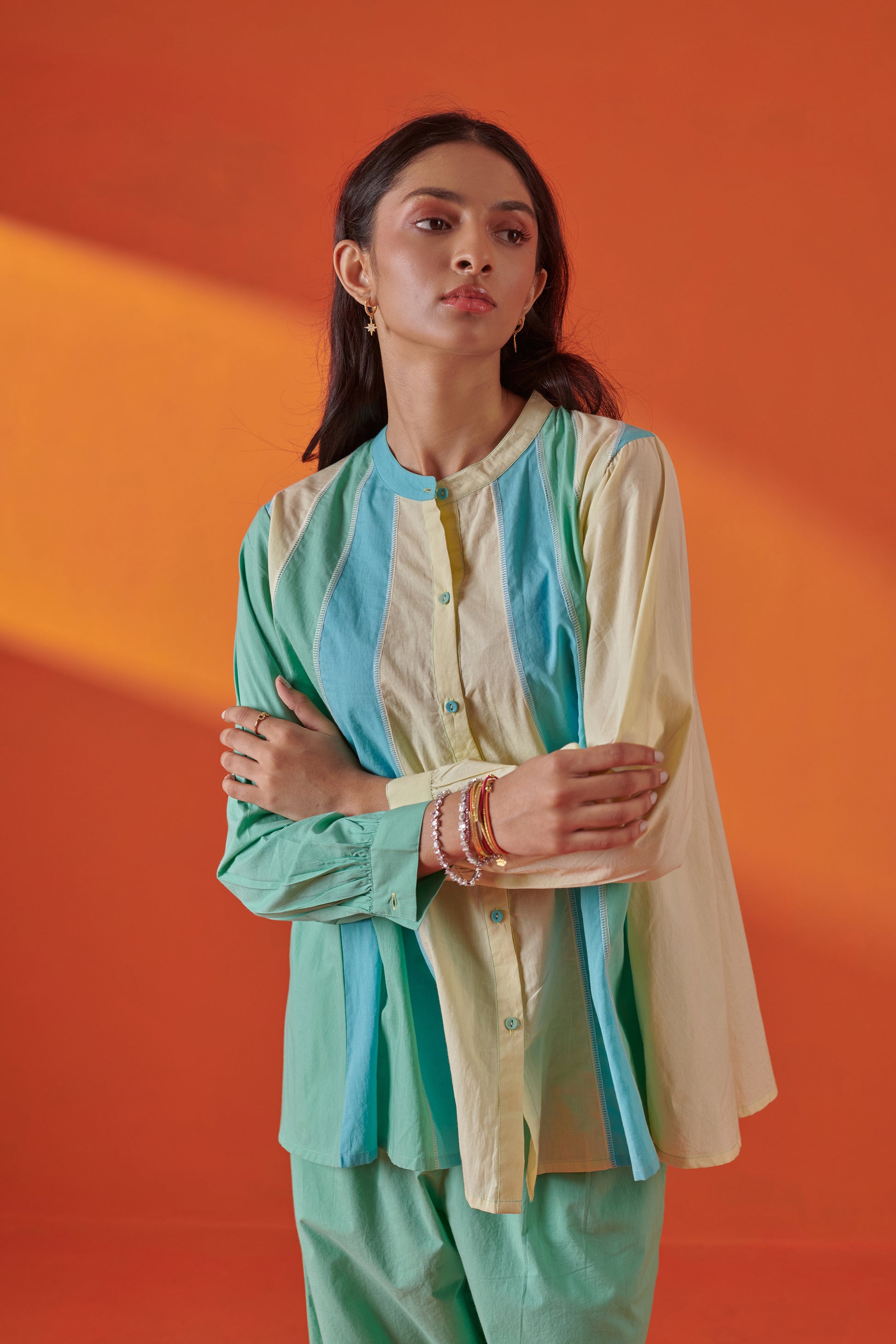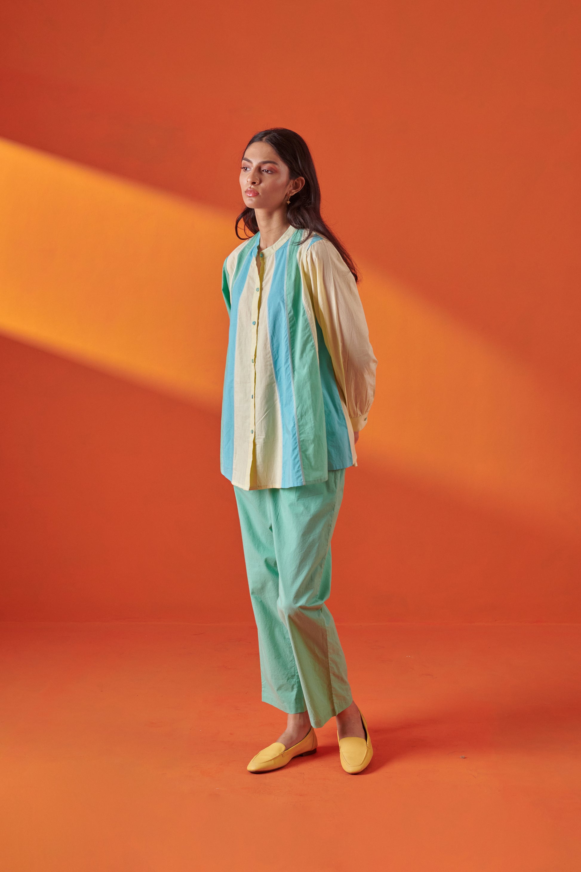 A statement in simplicity and ease. Front Features wide vertical panels in sorbet shades and the back surprises with a bold split of solid color blocks for added character. Full sleeves with gathered cuffs keep it breezy yet put-together