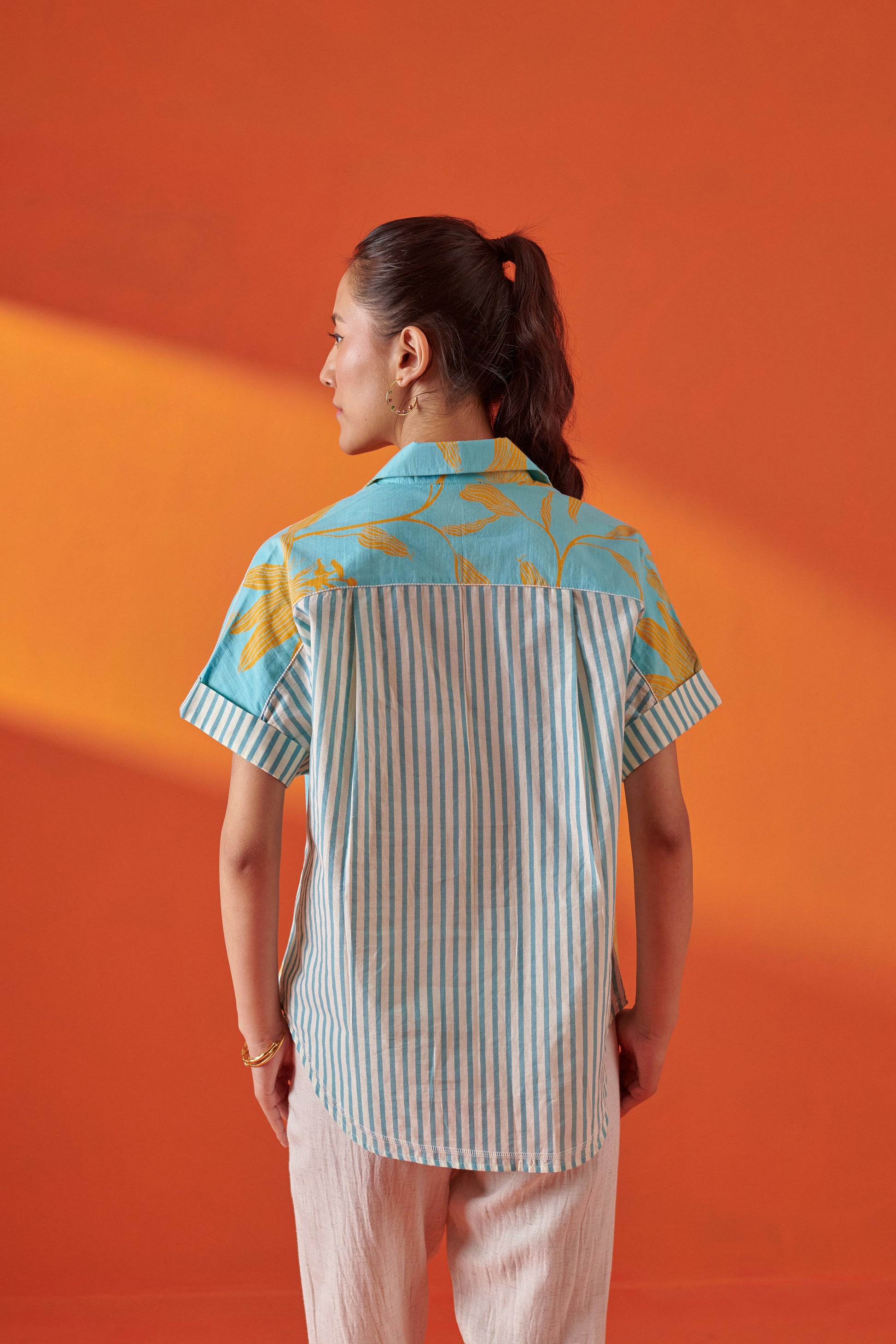 The Deco Shirt is your go-to for effortless style. The laid-back silhouette meets a bold floral print in aqua and yellow, with contrasting vertical stripes at the back and cuffs adding unexpected visual intrigue. It’s a fresh, playful take on the classic button-down, perfect for brightening up your everyday wardrobe.