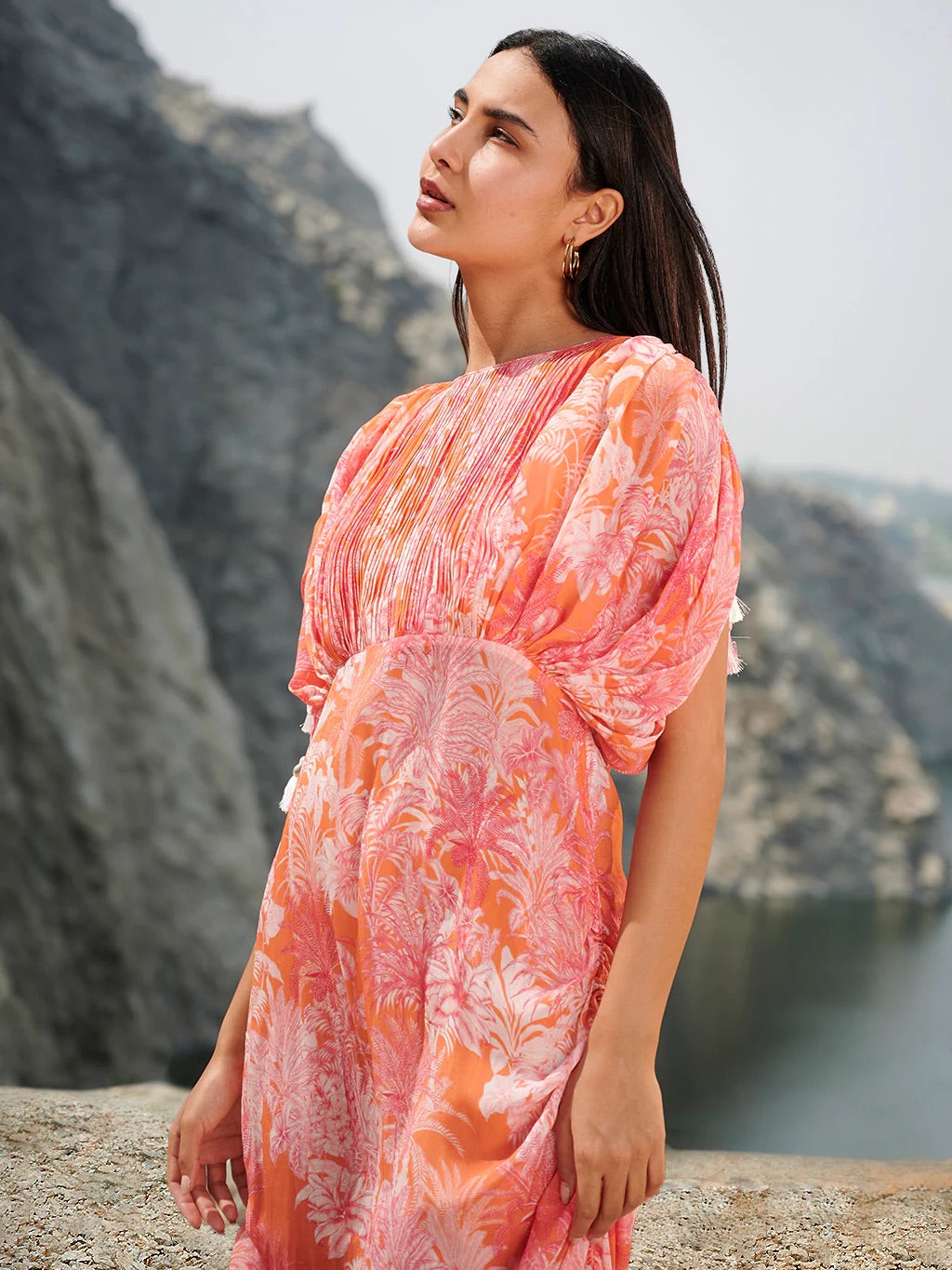 Step into a world of enchantment and grace with this breathtaking fun dress, adorned in a chorus of vibrant nature's prints upon a backdrop of luxurious bemberg crepe fabric. the tie up rouching on the side seam that adds a whimsical touch, cascading gracefully down the length of the dress, creating a mesmerising dance of movement and flow with pin tuck detail on the neck.